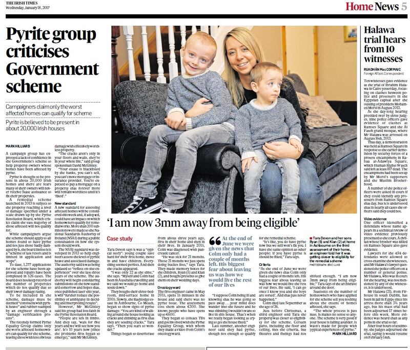 Finally, on February 26th, work began on clearing her house of pyrite. It will take three months to complete, so Ms Devon and her two children have moved back into her parents house in Ashbourne - which also has pyrite.