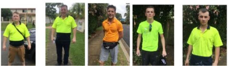 Another group of five men, who are photographed on the Australian police website, are accused of offering discounted repairs on tarmac driveways and roofing but providing sub-standard services or failing to show up.