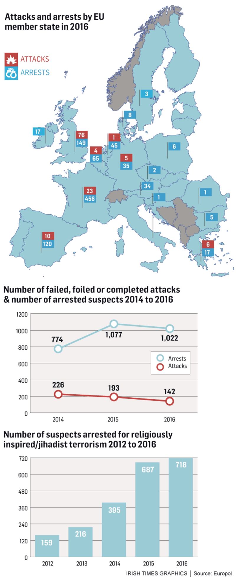 The vast majority of the 2016 fatalities – 135 of the 142 – resulted from 13 separate jihadist attacks, six of which were linked to Islamic State, according to the annual Terrorism Situation and Trend report, which calls for closer cross-border co-operation on intelligence sharing.