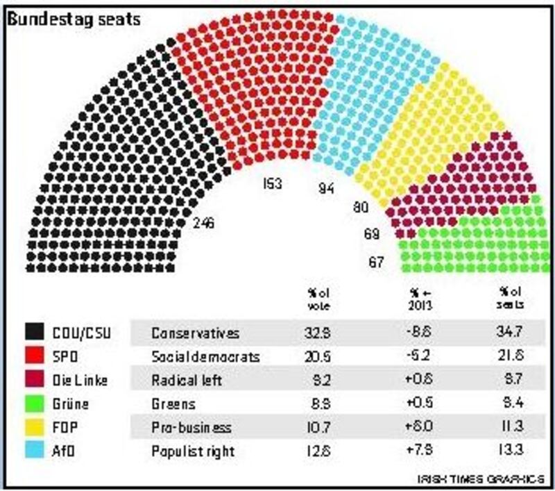 “All parties have a responsibility for forging a stable government,” said Dr Merkel in a nod to her outgoing coalition partners, the Social Democratic Party (SPD). It polled a 20 per cent, its worst-ever federal result, and plans to head to opposition.