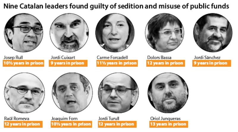 The court found nine defendants guilty of sedition, giving them jail sentences of between nine and 13 years in a decision which has once again inflamed tensions in the northeastern region. The former Catalan vice-president, Oriol Junqueras, received a 13-year jail term.