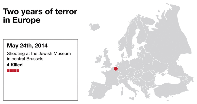 May 24th, 2014 - Four people are killed in a shooting at the Jewish Museum in central Brussels. The attacker was French national Mehdi Nemmouche (29), who was subsequently arrested in Marseille, France. Extradited, he is awaiting trial in Belgium. You can read more about this story here.