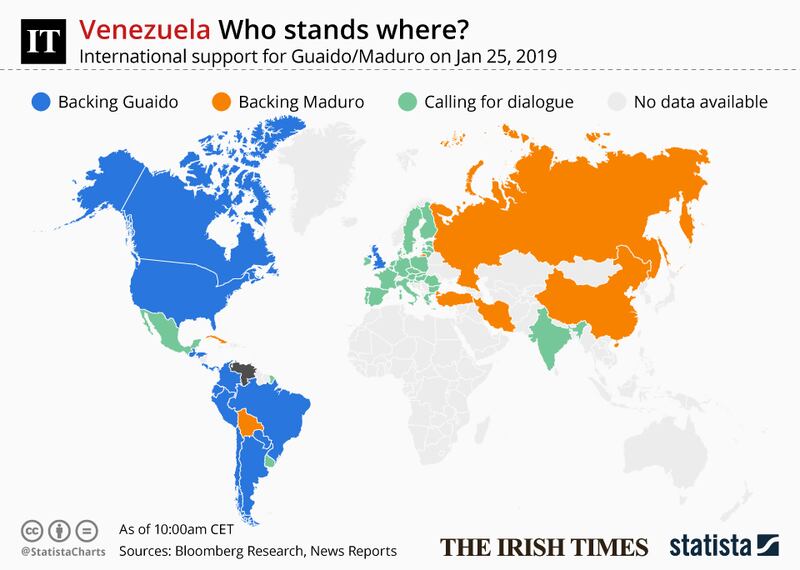 Russia and China back Mr Maduro, but France and Britain joined Spain and Germany in turning up the pressure on him, saying they would recognise Mr Guaidó as president unless Venezuela calls a new presidential election within eight days.