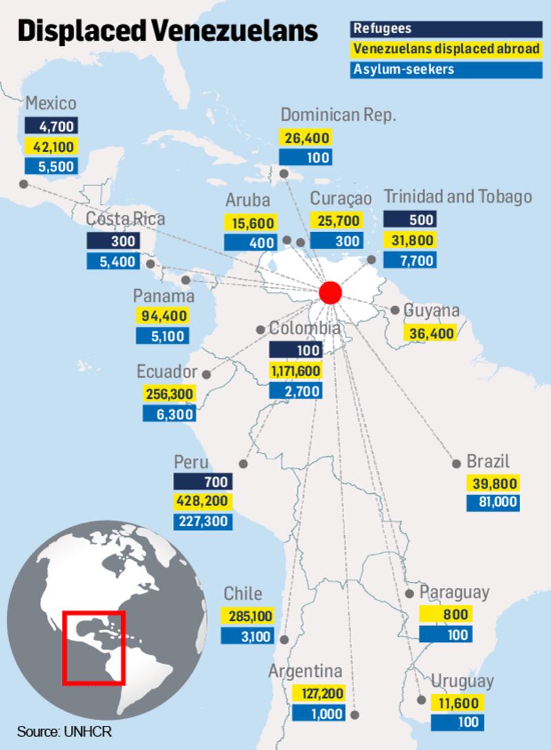 By the end of 2018, an estimated 4 million Venezuelans had fled violence, insecurity, food and medical shortages and fear of persecution in their home country. Colombia and Peru have accepted the highest number of Venezuelans but many have also travelled to Brazil, Ecuador, Chile and the Caribbean islands. An estimated 5,000 people continue to leave the country each day while 5 million are expected to have left by the end of 2019, UNHCR has warned.