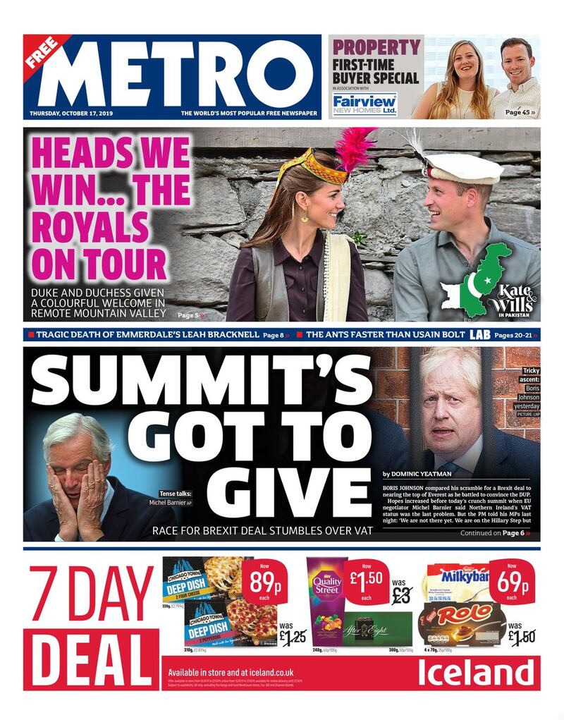 The Metro also refers to the Everest metaphor, but goes with the excellent punny headline: “Summit’s got to give”.
