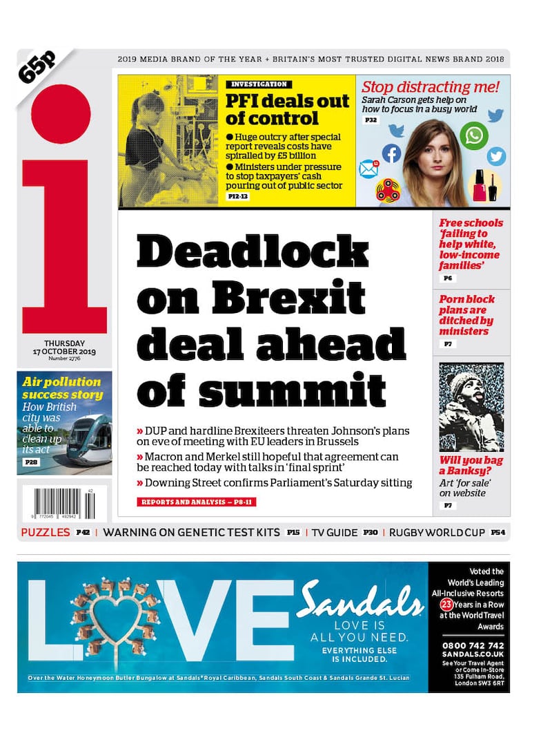 The i’s splash is: “Deadlock on Brexit deal ahead of summit”. The paper says the “DUP and hardline Brexiteers threaten Johnson’s plans on eve of meeting with EU leaders in Brussels” as “Downing Street confirms Parliament’s Saturday sitting”.