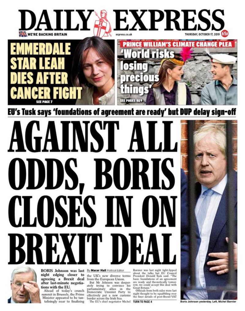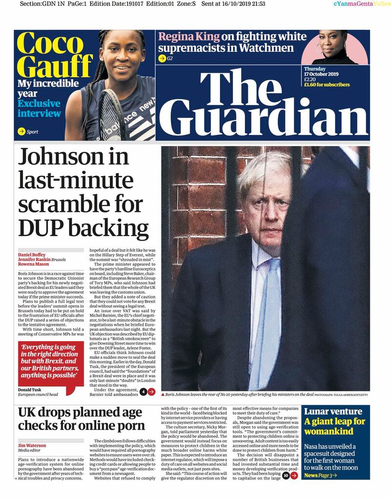 The Guardian has: “Johnson in last-minute scramble for DUP backing”, saying Johnson was “in a race against time to secure the DUP’s backing for his newly negotiated Brexit deal”.