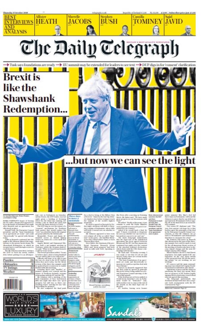 The Telegraph quotes the British prime minister, who likened Brexit negotiations to the prison break movie Shawshank Redemption. Its headline is: "Brexit is like the Shawshank Redemption … but now we can see the light."