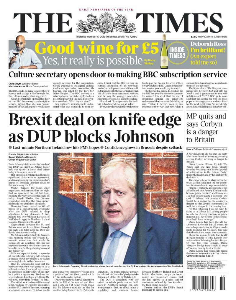 The Times says the “Brexit deal was “on knife edge” and Johnson’s “fate was in the hands of the DUP”, but sounds a note of optimism, saying that “confidence grows in Brussels despite setback”.