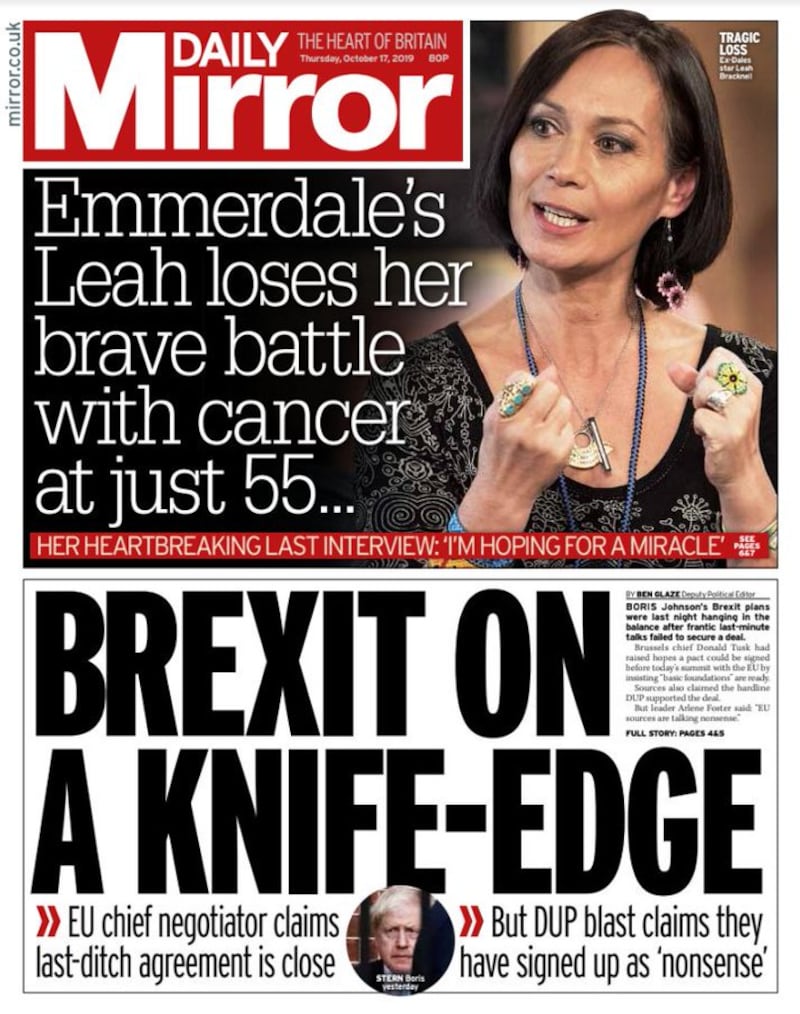 The Mirror strives to communicate the precariousness of the deal, saying Brexit was “on a knife-edge”, that it was “hanging in the balance” and that the “last-ditch agreement” was close but still needed the support of the DUP.