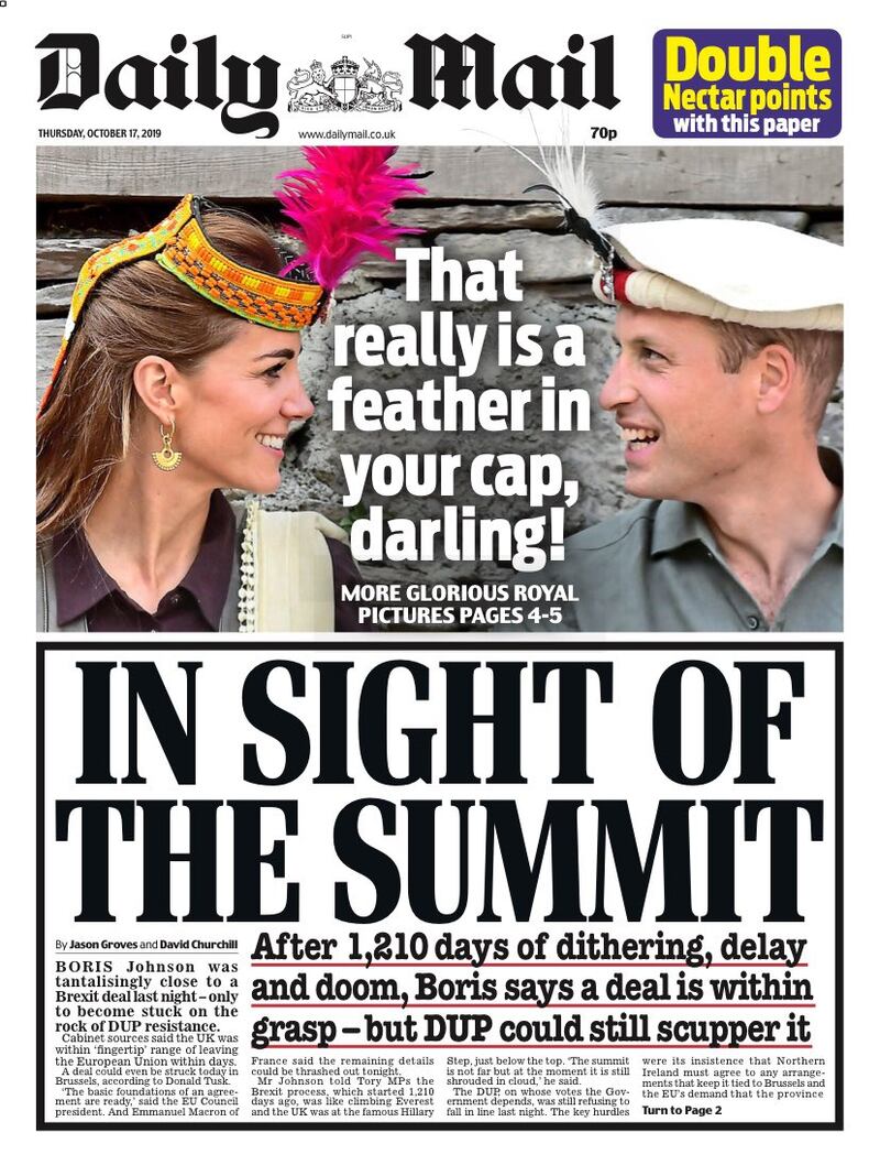 The Mail, always a fan of letting readers know exactly how long it has been since the Brexit referendum, says: “After 1,210 days of dithering, delay and doom, Boris says deal is ‘fingertip close’ – but DUP could still scupper it”.