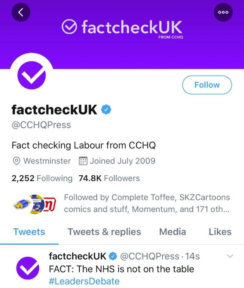 In the spin room after the debate, Johnson's team were claiming victory on the basis that Corbyn needed a game-changer and failed to achieve one. But the Conservative press office faced criticism for changing its Twitter handle during the debate to FactcheckUK, with a logo designed to make it look like an independent fact checker. On BBC's Newsnight, party chairman James Cleverly struggled to justify the manoeuvre, which interviewer Emily Maitlis described as "dystopian".