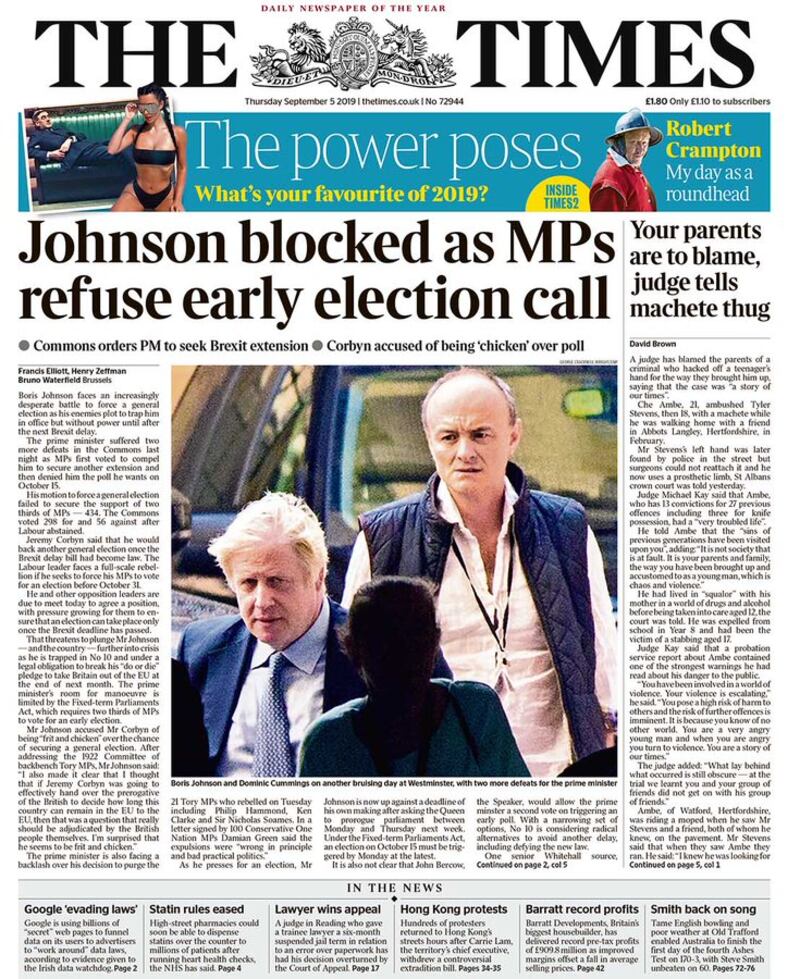 The Times says “Johnson blocked as MPs refuse early election call”. The paper says the PM suffered “another bruising day at Westminster” and “faces an increasingly desperate battle to force a general election”.