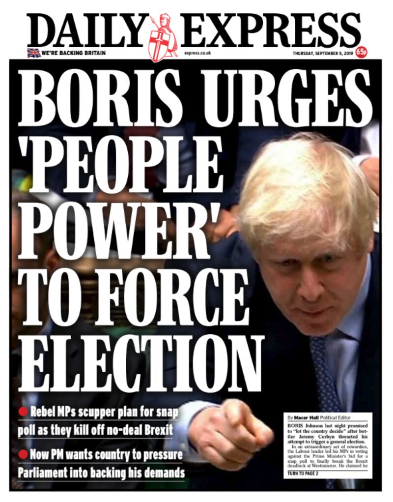 The Express calls Corbyn’s refusal to back the calls for an election “an extraordinary act of cowardice” and said Johnson “wants country to pressure Parliament into backing his demands: “Boris urges ‘people power’ to force election”.