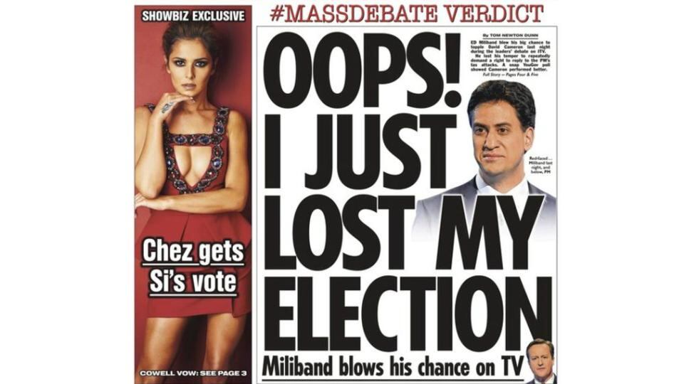 The Sun also came down heavy on Ed Milband's performance, leading with "Oops! I just lost my election", while the Daily Express gave "Cool Cameron" the win.