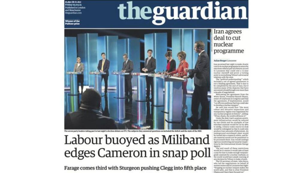 The Guardian led with "Labour buoyed as Miliband edges Cameron in snap poll", while the Daily Telegraph reported the opposite view, with "Miliband flops as outsiders shine".