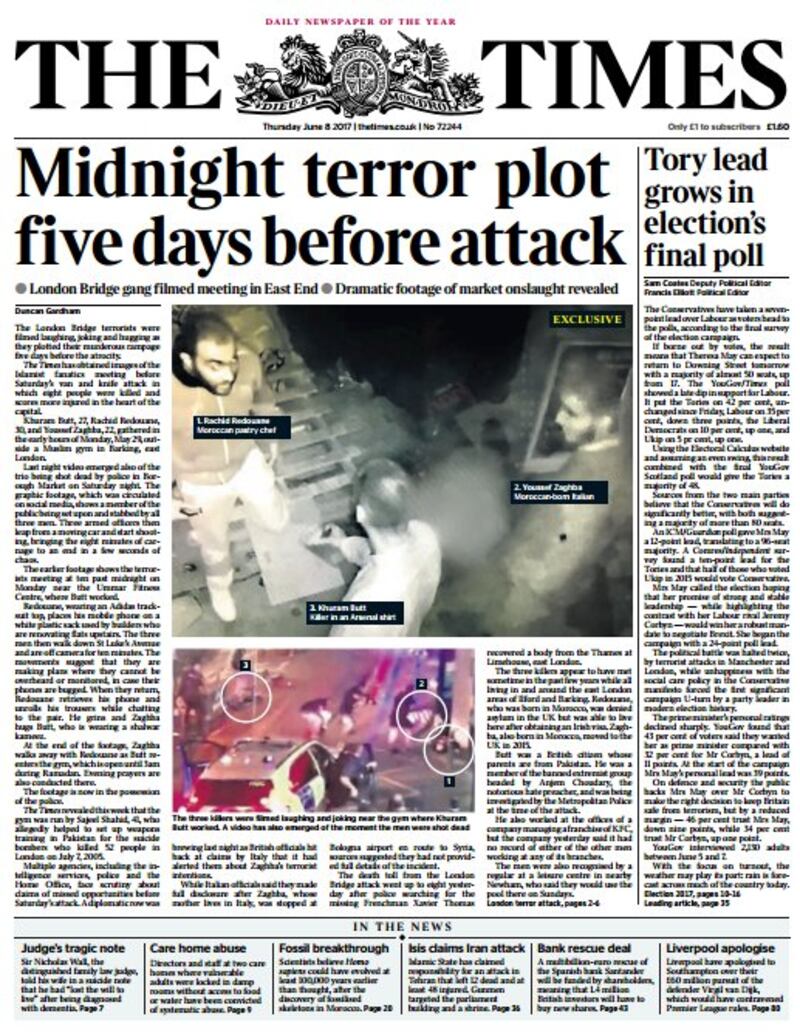 The Times is the only one not to lead with the election, focusing instead on footage of the London Bridge attackers “laughing, joking and hugging as they plotted their murderous rampage”. In a smaller story they report on the latest election polls, which show a late rise in support for the Conservative party.