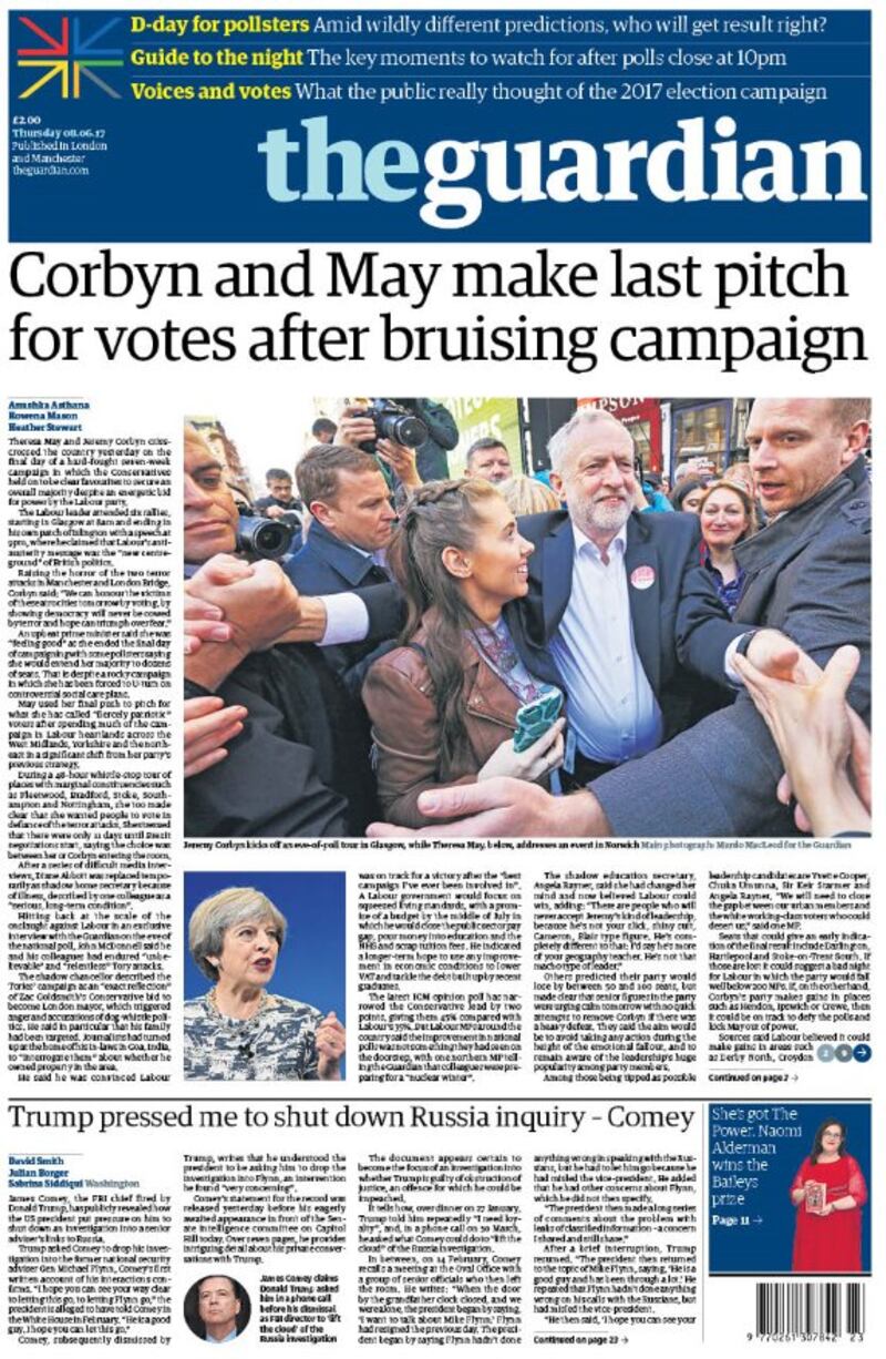 Although The Guardian has officially backed Labour, their final front page takes a neutral approach and reports on the final day of campaigning. With the polls varying wildly, all parties seem fairly optimistic.