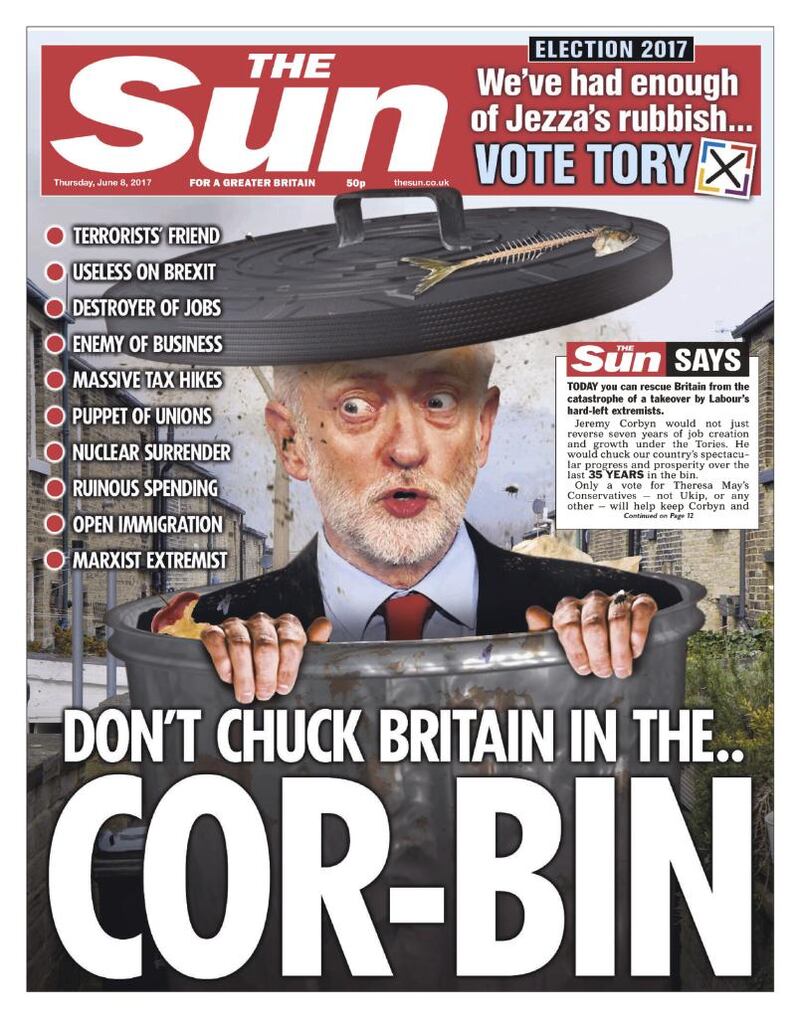 With a startling Photoshop of Jeremy Corbyn as Oscar the Grouch, The Sun begs voters: "Don't chuck Britain in the Cor-bin". The article calls readers to vote for the Conservative party in order to keep "Corbyn and his sinister Marxist gang" out of Number 10, adding that "if Theresa May is re-elected, Britain can breathe a sigh of relief."