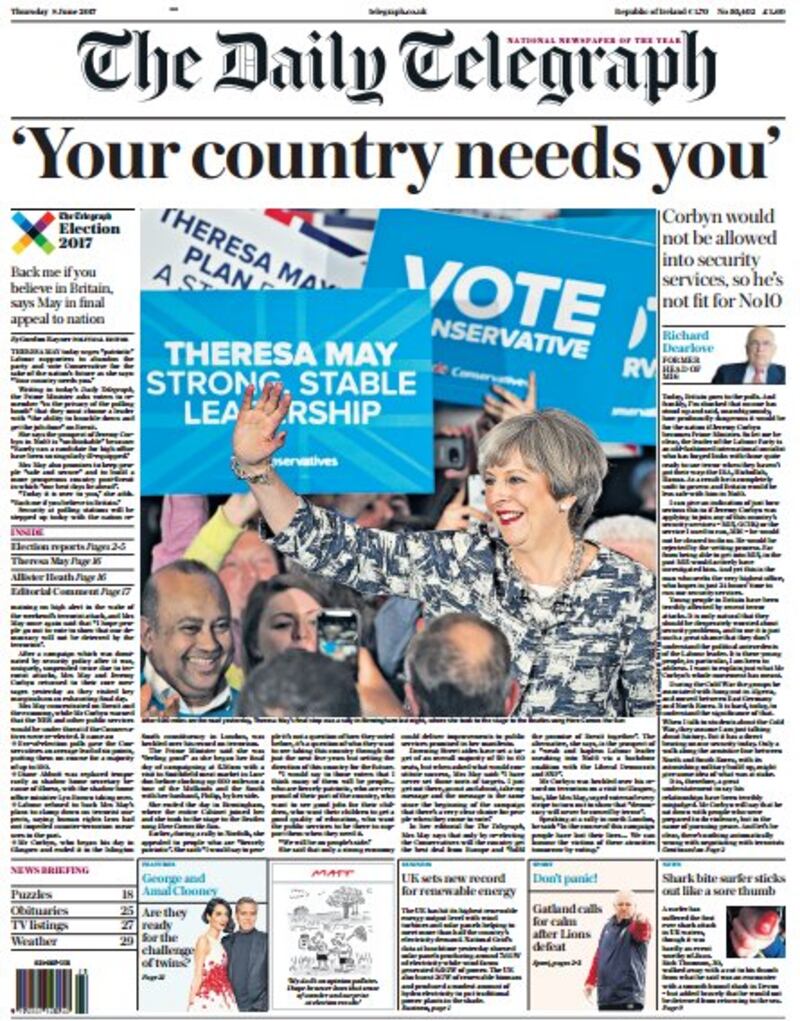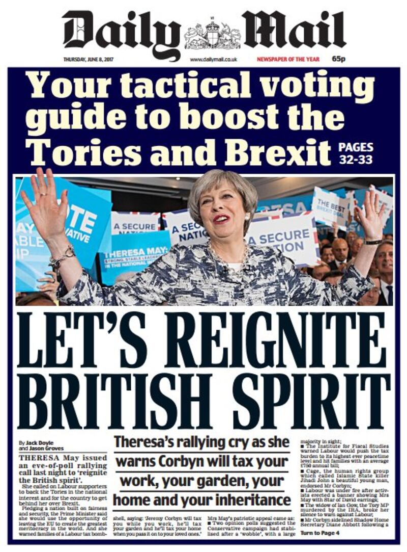 The Daily Mail is, unsurprisingly, heavily in favour of the Conservative party. They report on Theresa May’s “rallying call last night to ‘reignite the British spirit’.” The tone of the lead article is very confident that May will be returned to office, but just in case they have a detailed guide on how to vote tactically in key constituencies.