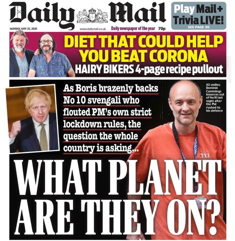 “What planet are they on?” the Mail screams on its front page, saying that is the question the nation is asking about the “No 10 svengali who flouted the PM’s own strict lockdown rules”, and about Mr Johnson “brazenly” supporting him.