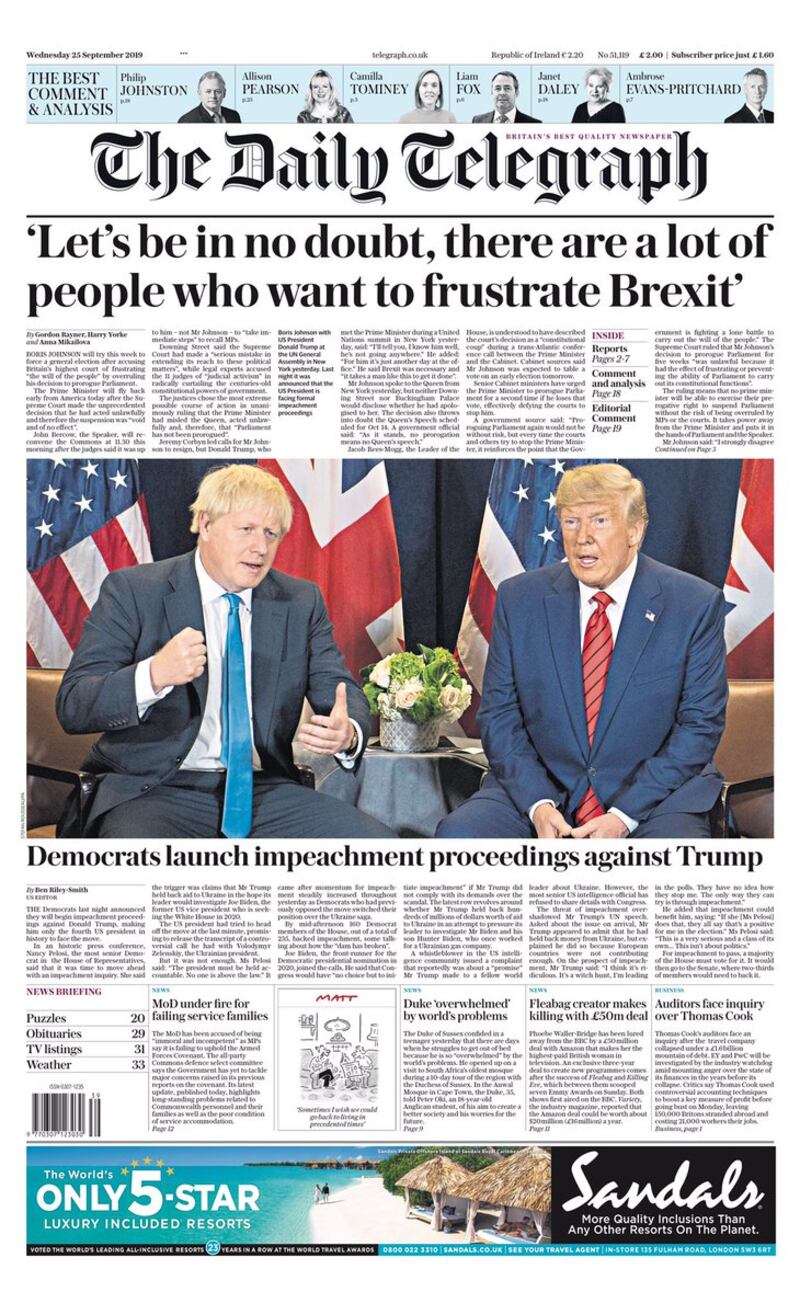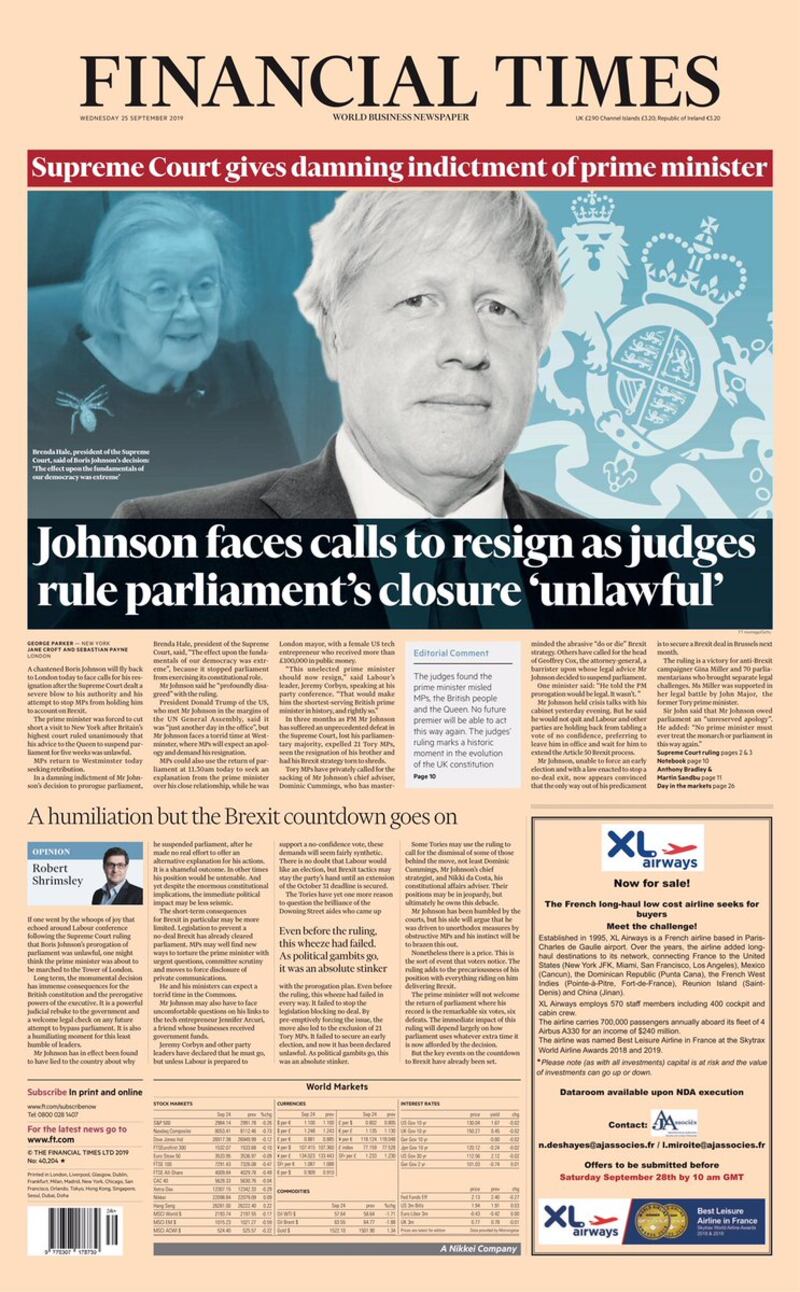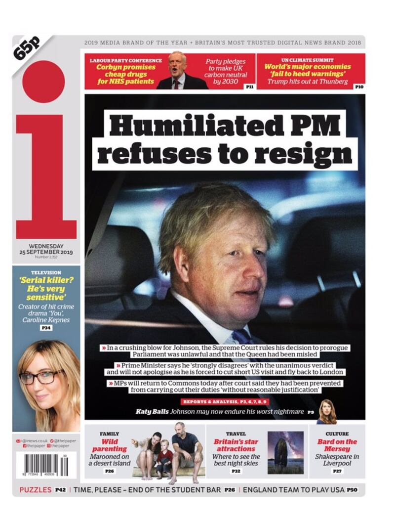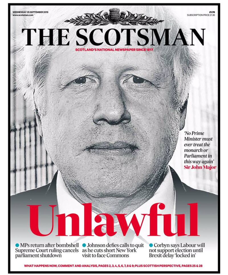 Editorial – "The first thing Boris Johnson does upon his return to the House of Commons should be to announce his immediate resignation. Yesterday's ruling by the Supreme Court that his government's decision to prorogue parliament for five weeks was unlawful is no mere scrape from which Mr Johnson should escape unscathed. Rather, it represents the most damning verdict on his integrity. In short, the unanimous verdict of 11 justices makes clear that Mr Johnson is unfit to be the prime minister of the United Kingdom. "