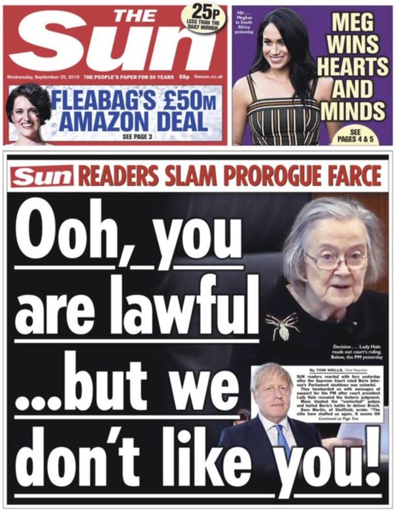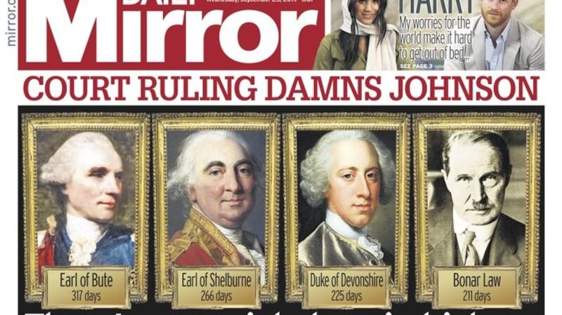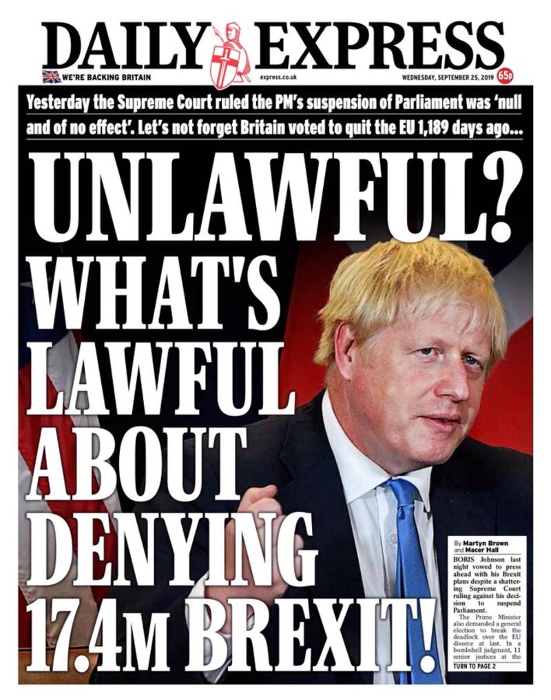 “Boris Johnson last night faced calls to quit after judges he illegally shut down parliament as he tried to force through a no-deal Brexit. The verdict confirms he lied to the Queen over his reasons for prorogation. After just 63 days in the job, he could be the short-served PM ever if he goes.”