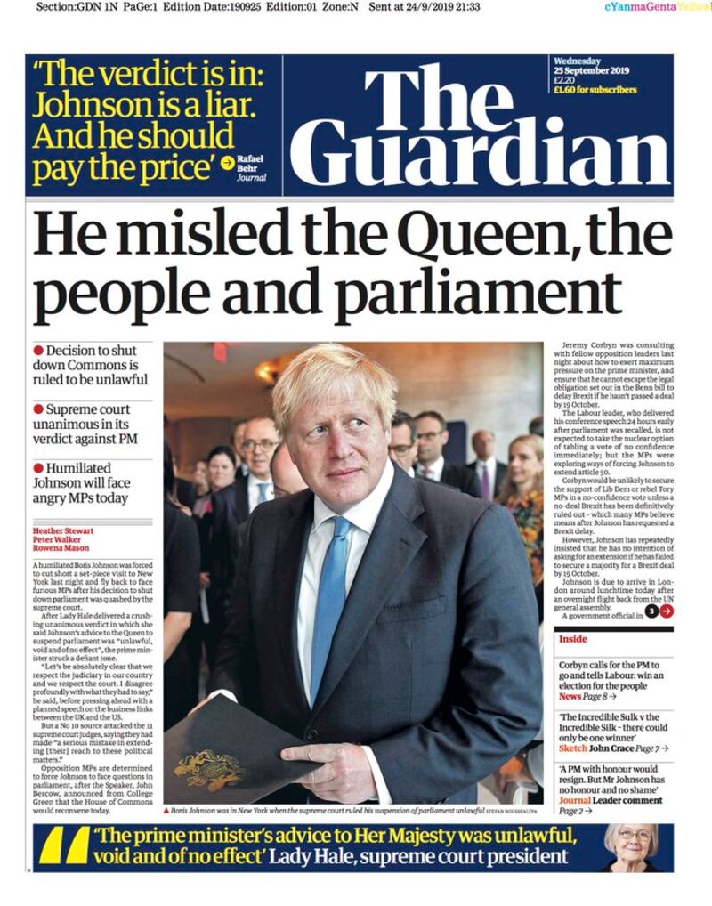 Editorial – "The ruling by the UK supreme court is a devastating indictment of the abuse of power by a prime minister – and of the holder of that officer Boris Johnson. Mr Johnson's no-deal strategy lies in tatters. Prorogation, always a high-risk gambit, has galvanised MPs to use the short time they had to bind Mr Johnson's hands with legislation, and cost him his majority. Now this ruling leaves a stain on his character and competence. Faced with such a damning judgment, any premier with a shred or respect for British democracy and the responsibilities of his office would resign."