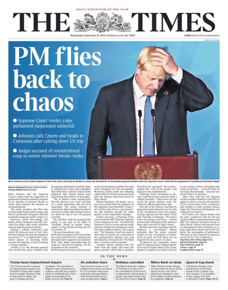 Editorial – "The Supreme Court's verdict could hardly be more devastating for Boris Johnson. Not only did the court find that the prime minister had acted unlawfully in his decision to suspend parliament for five weeks until October 14th, but the 11 justices did so unanimously. They concluded that Mr Johnson had set out to prevent parliament from performing its constitutional role of holding the government to account."