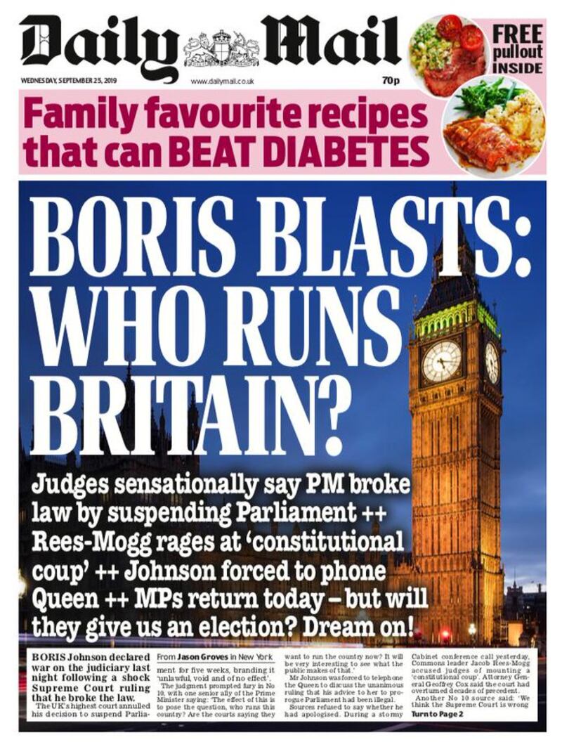 “Boris Johnson declared war on the judiciary last night following a shock Supreme Court ruling that he broke the law. The UK’s highest court annulled his decision to suspend parliament for five weeks branding it ‘unlawful, void and of no effect’.