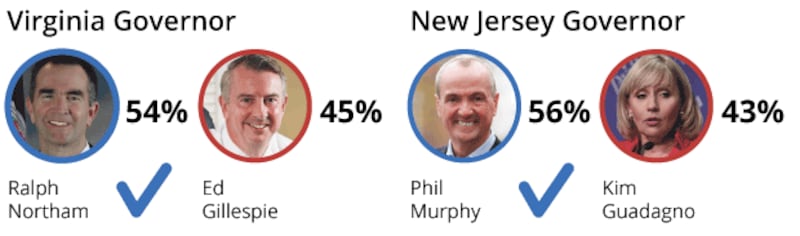 The Democrats' electoral validation, though, took place well beyond the Virginia governor's race: They wrested the governorship of New Jersey away from Republicans, swept two other statewide offices in Virginia and made gains in the Virginia legislature, and won a contested mayoral race in New Hampshire.