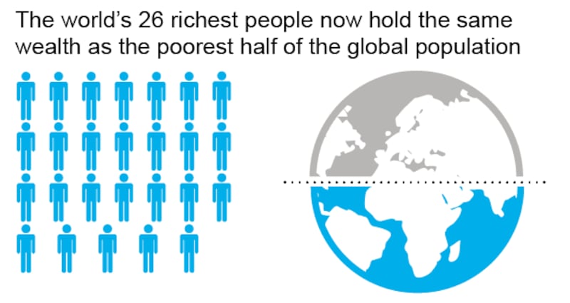 The world’s 26 richest people now hold the same wealth as the poorest half of the global population, down from 43 in 2017, the charity said.