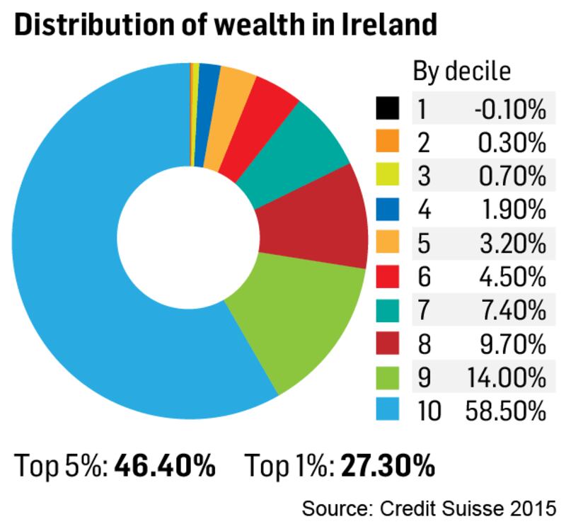 Both surveys revealed startling high levels of wealth inequality. The top 5 per cent in the HFCS survey owned 37.7 per cent of all the wealth in the country, while the top 1 per cent owned nearly 15 per cent. The Credit Suisse data was even more dramatic, stating that the top 5 per cent owned 46.4 per cent and the top 1 per cent owned an extraordinary 27.3 per cent of the total wealth of the country.
