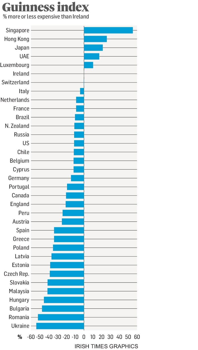 But in almost all cases, the price of a pint of Guinness gets cheaper when it leaves Ireland. In some cases the difference is enormous. In Spain and Greece Guinness is 34 per cent cheaper than it is here. In Germany a pint of stout is 15 per cent cheaper and in Austria 25 per cent cheaper.
