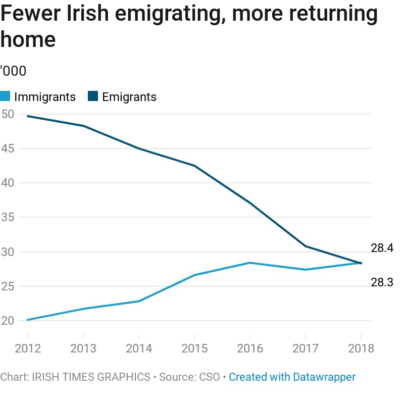 For the first time in 10 years, more Irish citizens returned home than left the country. The overall effect was an increase of 64,500 residents for the year, bringing the population to 4.857 million.