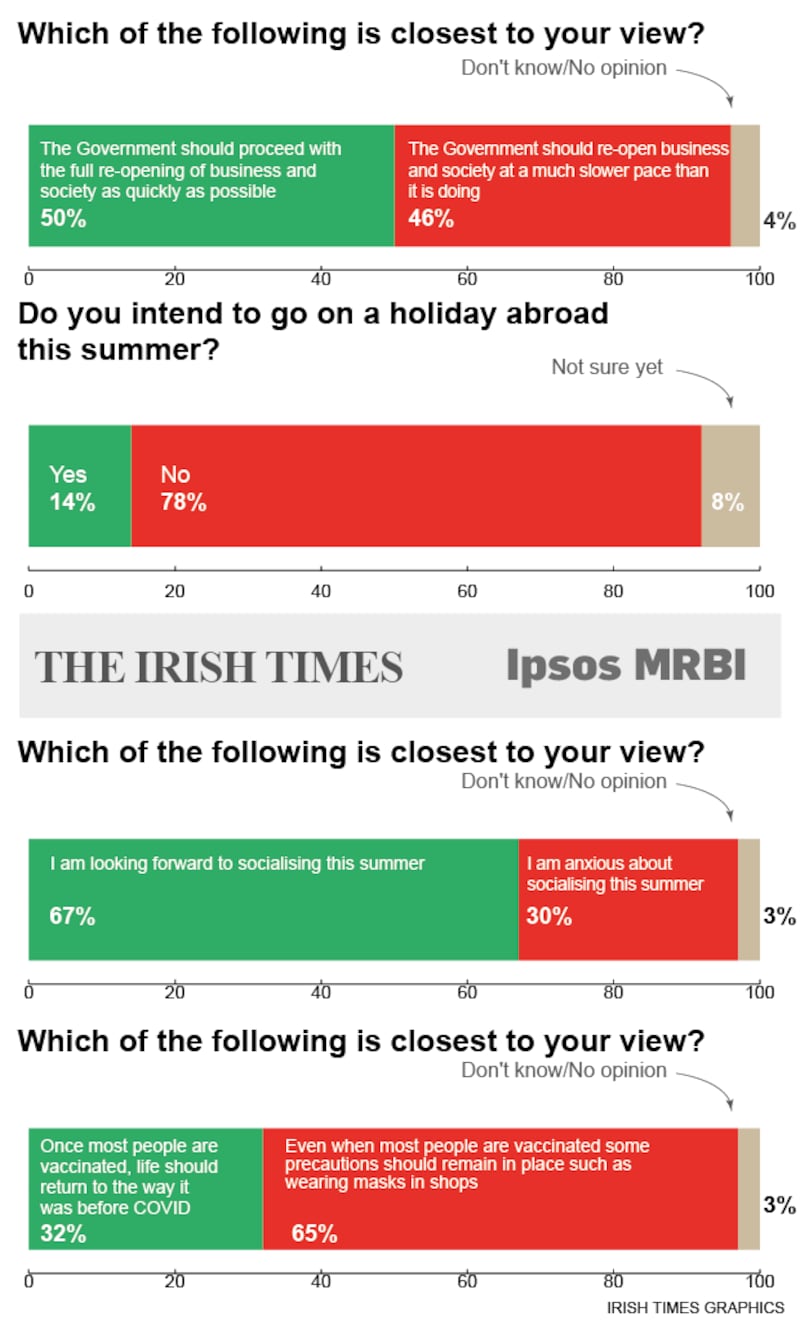 There is a wide variation in the views of different age groups. Those under 35 favour a rapid reopening by a margin of almost two to one. By contrast those over 65 favour a slowdown by a similar margin. Given that almost all the over-65s have had a least one dose of the vaccine by now the poll indicates a level of fear among the older age groups that will take some time to dissipate.