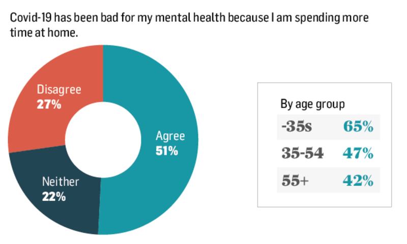 This difference is reflected in the way people feel about their own mental health. Among those under 35, a massive 65 per cent feel that the pandemic has been “bad for my mental health because I am spending more time at home”. Among those over the age of 55, just 42 per cent feel the same way.