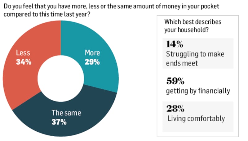 In the 2020 study, 40 per cent of people said they were “living comfortably” – now this is down to 28 per cent. At the other end of the scale, the proportion reporting themselves as struggling to make ends meet has risen from 12 to 14 per cent. More and more of us are bunched in the middle (“getting by”) – a category that has increased sharply from 48 to 59 per cent.