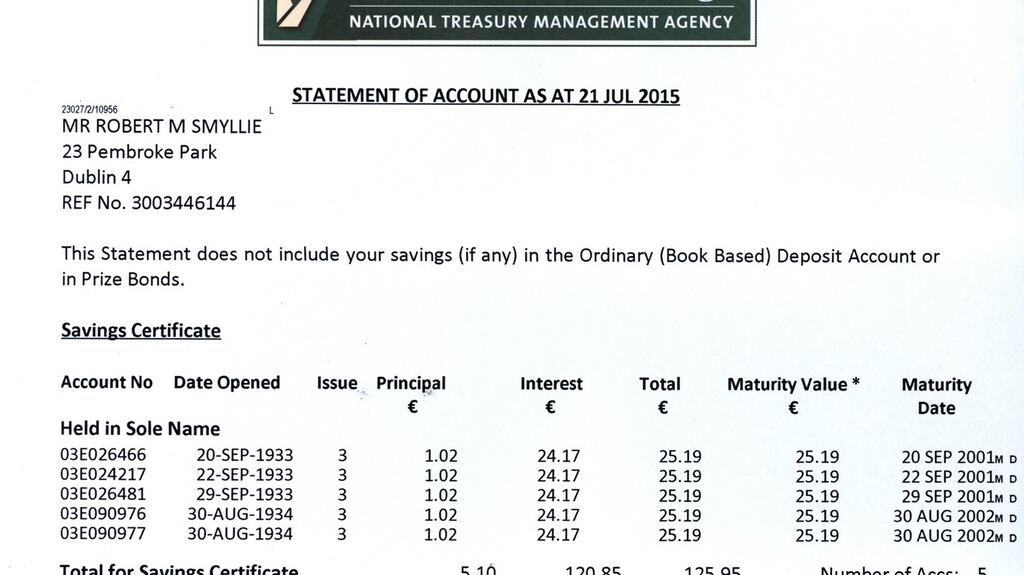 It did so throughout the Lemass years, the 1973 oil crisis, the grim 1980s, and the early Celtic Tiger era. In fact, only in 2001, 68 years after he’d invested in it, did the first savings cert mature. The last followed a year later, since when the total amount – now a splendid €125.95 – has remained untouched.