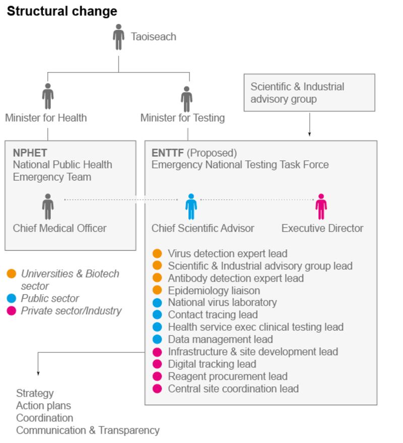 An effective emergency national testing task force would require political legitimacy and empowerment. A senior Minister for Testing would have the ability to make rapid decisions as the situation evolves, in daily direct contact with the Taoiseach. This task force would be led by a senior scientist (for example, the Chief Scientific Adviser) and an Executive Director from the private sector. It would include industrialists, scientists, and managers in testing, tracing, and data management. It would work strategically - informed by the most current international scientific knowledge, with the pace and capacity of the commercial sector, but with the legitimacy and authority of state. For public confidence, it would work in a transparent fashion following the New Zealand model.