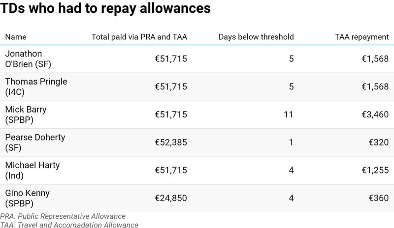 An analysis of expenses paid out in 2018 by the Houses of the Oireachtas reveals six TDs and a Senator were paid less than the standard travel and accommodation allowance (TAA) for not attending the Dáil or Seanad for the required minimum of 120 days.