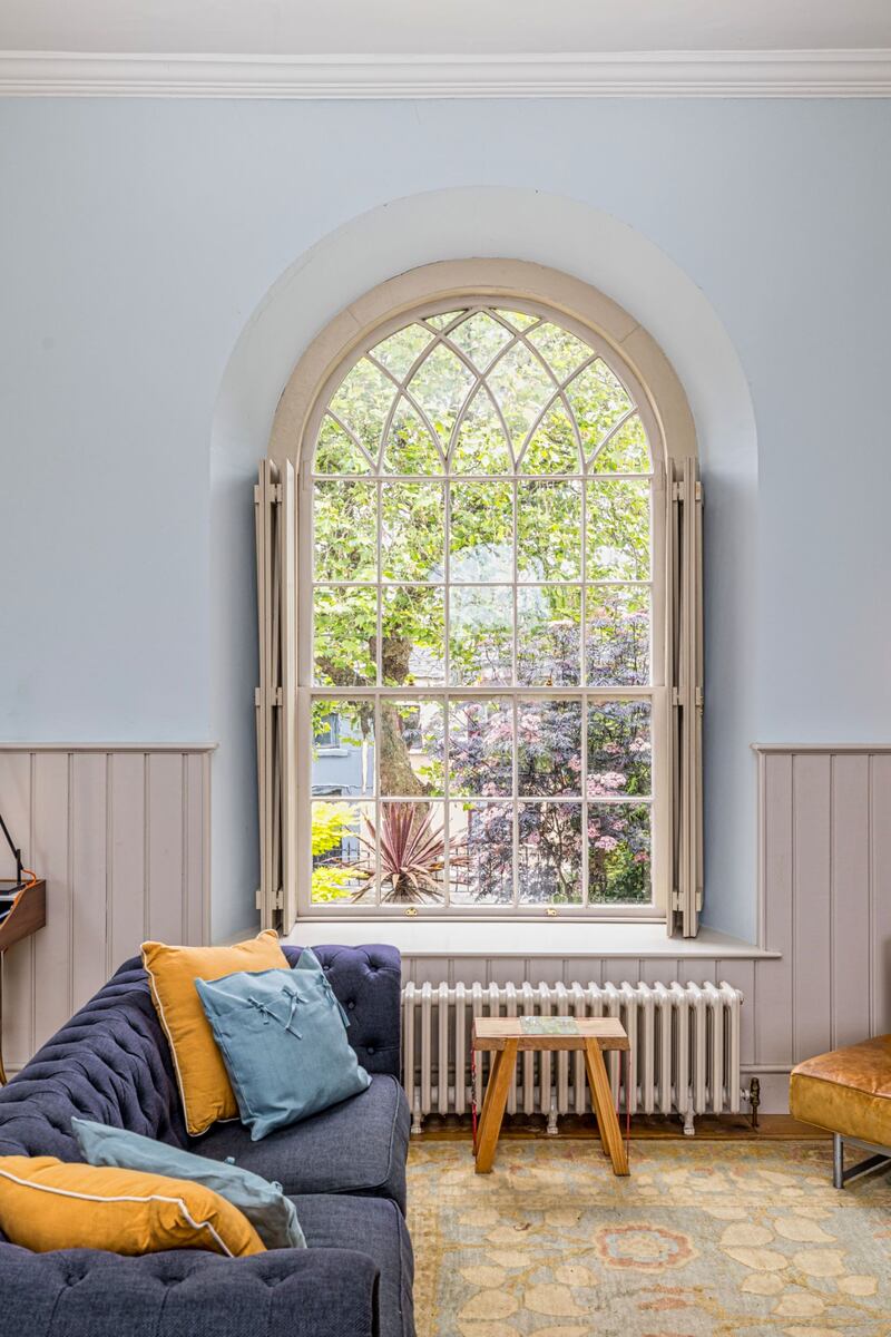 Ceiling heights exceed 4m and the pair of round-headed sash windows with timber Y-tracery to the front have mirror images overlooking the wild garden next door. This is not part of the property but remains within the curtilage of the church.
