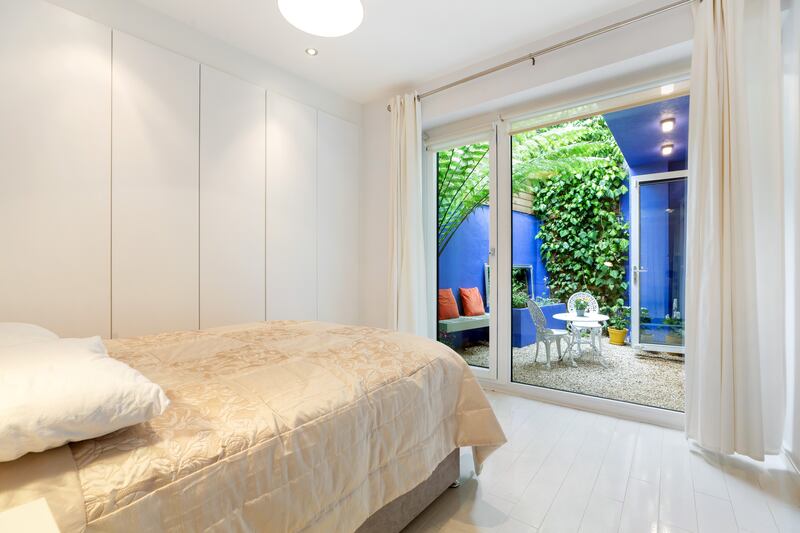 Two of the bedrooms open on to an enclosed courtyard with high walls, which has been turned into a zen-like space for relaxing, with gravel underfoot, ivy, large potted plants and mirrors. Rather than vainly try to bring light in, the owner painted the walls a warm, dark blue to make it feel cosy and atmospheric.