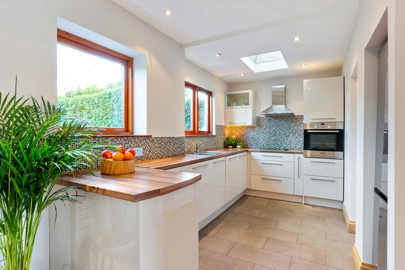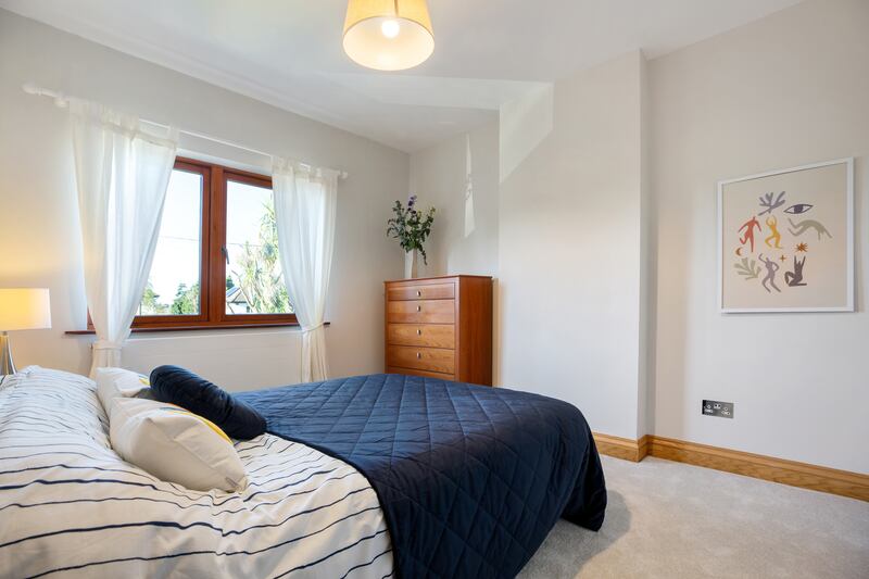 The house is set well back from the main road, and the long gravel driveway has room for up to three cars. A tiled porch leads to a bright, spacious entrance hall, with engineered maple floor, wall-mounted shelf and ample understairs storage. Through a glass-panelled door you get to the main living space — bright, roomy, and with engineered maple floors and inset lighting. French-style patio doors lead out to the rear deck and garden. The kitchen, designed by Lisa Maher, has fully fitted bespoke units and fully tiled floor, and a skylight above lets in lots of natural light. The mosaic-tiled splashbacks add a lovely touch. There’s a small utility room off the kitchen, and that leads into the garage, which offers scope to convert into a den, a playroom or a fourth bedroom.