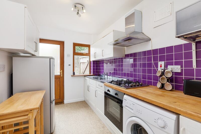 At the back of the house, the kitchen is small and narrow with white units, a well-worn, purple-tiled splashback and a linoleum floor. A new owner would likely look to refurbish the kitchen and extend it to the side, joining it to the living space, to create a more functional open-plan space, subject to planning permission.