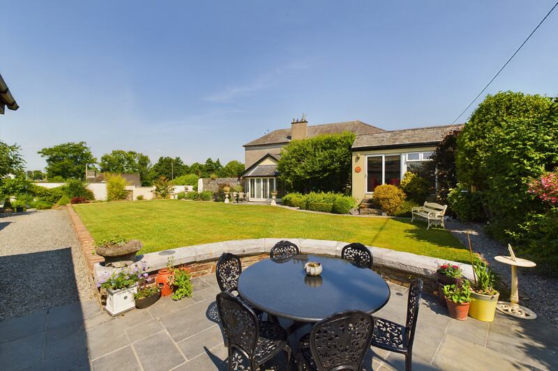 Despite the property being on a prominent village site, its gardens are private. “It feels you are miles from civilisation,” say the owners, who gave the grounds a total overhaul about 15 years ago. After entering the property through electric gates, where there are two car spaces, steps lead up to the gardens, which are set over two levels. With patios to catch the path of the sun, a garden feature based on the one in Lismore Castle is used against a wall, whereby water — recycled underground — ebbs and flows over a limestone slab.