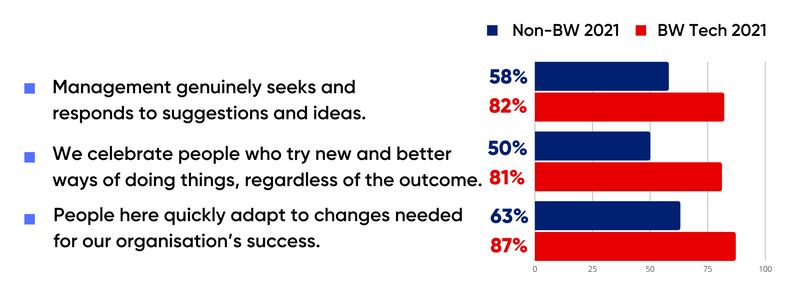 Innovation is the lifeblood of the tech industry. In a fast-moving and agile digital industry, it is only through the development of new offerings that organisations can continue to grow. When employees feel they can be themselves and that they are supported by their colleagues, the culture becomes a space where creativity is supported. It is organisations that facilitate and celebrate innovation that employees most want to be a part of.