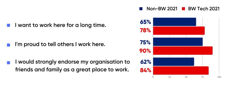 What do these organisations receive in return? An engaged and committed workforce of employee ambassadors. Their investment is repaid in the resources saved through retaining their talent. Their efforts are rewarded through employee advocates, recommending their network through employee referral programmes, saving the organisation time and money. This is the picture painted by the survey data from Best Workplaces in Tech employees.