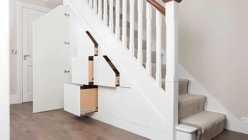The other popular use for the under-stair void is to install slide-out drawers. Steve Byrnes of Complete Carpentry Service quotes an average of €550 for a two-door, and €860 for a three-door, pop out drawer system.