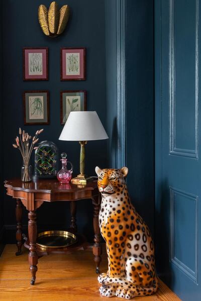 “It’s everything I wouldn’t have done 10 years ago. There are jaguars on the wallpaper, there are oriental pieces in there, there’s a blush pink marble table that took me about a year to decide upon. It’s a really important room to me. It’s got animal stuff, the dark hues I love, the natural stone and a lot of brass touches as well and a lot of sentimental pieces in terms of antiques and ceramics passed down from my mum.”